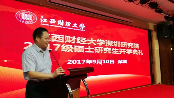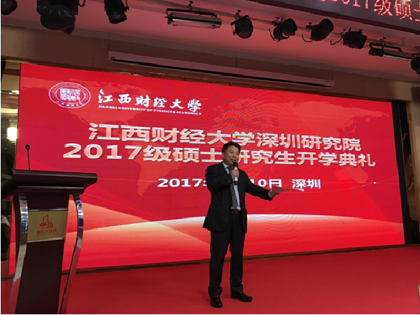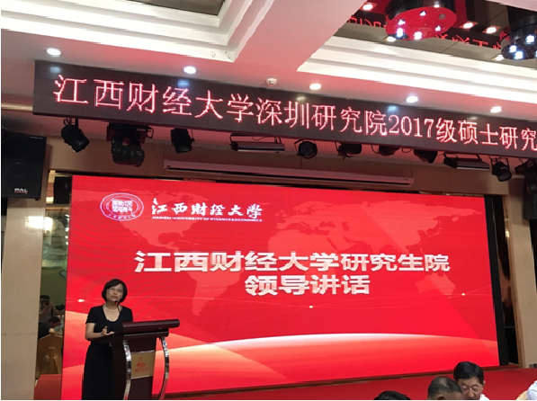 唐琼冬同学代表2017级研究生发表入学感言,表示成功入学江西财经大学是对各位研究生的肯定和认可,同时也是对各位研究生的期待和盼望,是一份责任,所有2017级研究生将不辱使命,工作学业两手抓、两不误,出色完成各项学习任务,努力成为又红又专人才。