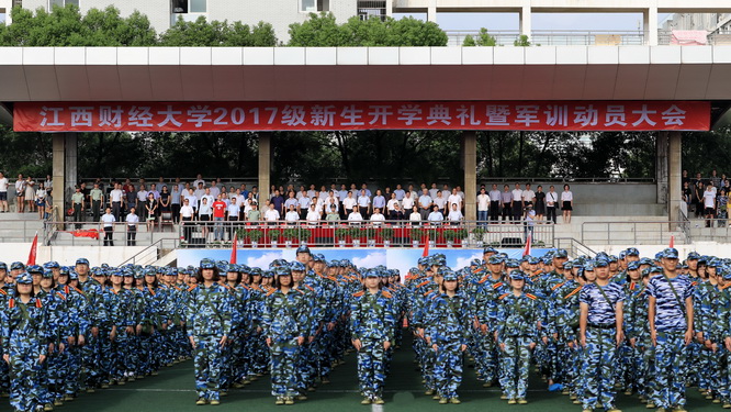9月12日上午,2017级新生开学典礼暨军训动员大会在麦庐园校区举行。校党委书记王乔,校长卢福财,党委副书记蒋金法,副校长刘小丽,纪委书记杨建林,副校长王小平、欧阳康、袁雄,陆军步兵学院军训办主任马龙生大校、军训团团长陈丰收中校,杰出校友代表、英国切斯特大学商学研究院国际院长孙鸿出席典礼。开学典礼由校党委书记王乔主持。校属各职能部门负责人、学院院长、党委书记,2017级全体新生、家长代表参加开学典礼。