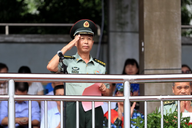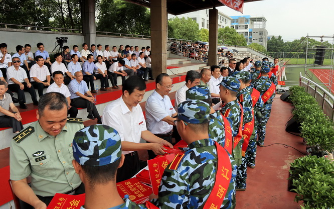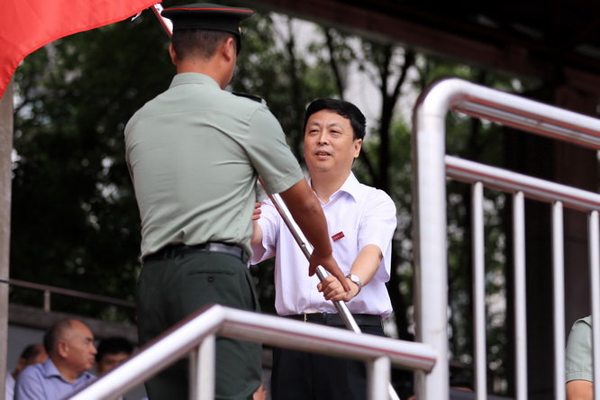 王乔为军训连队授旗,主席台下热烈的掌声此起彼伏。