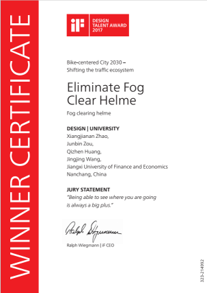 除了认真完成课堂学习之外,艺术学院产品创新设计工作室是她梦想的起点,也是她专业学习鏖战时间最长的地方,她认为和其他设计团队成员在这里奋斗的日子值得永远记忆。在工作室中,她始终保持着一颗学习的心,虚心向他人请教,并注重团队合作,努力补齐自己的短板。对于所学的产品设计专业,她有自己独到的认识和见解,善于从生活中发现和捕捉设计问题,通过掌握的设计方法和专业技能解决设计问题。例如2017IF的获奖作品“Eliminate Fog · Clear Helmet”(视线清晰头盔)设计出发点是解决雾霾日趋严重的环境中,人们出行时视线受影响情况下的安全出行问题。她敢于尝试和探索新事物,设计了很多不同的作品,很好地培养了自身综合能力。
