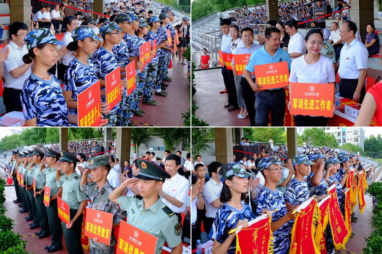 蒋金法宣读《关于表彰2017级新生军训先进集体和个人的决定》,在场校领导为获奖集体和个人颁奖。今年我校共有5100余名新生完成军训,产生10个军训先进排、10名军训优秀教官、5名军训先进工作者、417名军训先进个人。