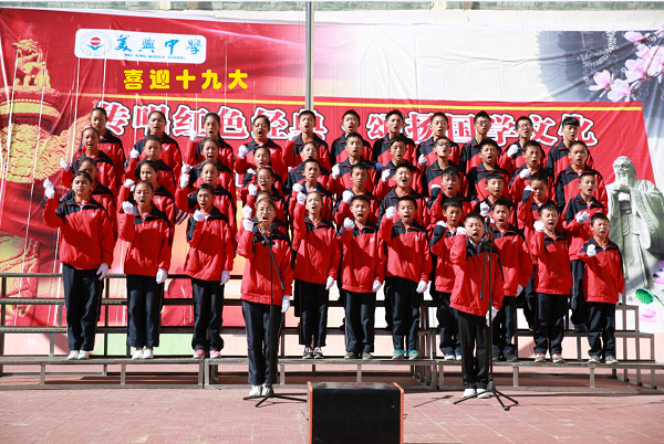 在美兴中学升旗广场上,全校15个班级700多名学生参加本次比赛。比赛中,每支合唱队身着统一服装,以整齐的队列、饱满的激情、良好的精神面貌闪亮登场,以铭记红色历史、歌唱祖国、歌唱美好新生活为主旋律。其中,八年级(4)班的《唱支山歌给党听》、七年级(5)班带来的《争做党的好少年》等一首首耳熟能祥、豪迈雄壮的经典歌曲和诗歌,不断地把人们带回那战火纷飞的峥嵘岁月。舞台上,每一个学生奋力拼搏,把最美的诗歌朗诵献给党,用最饱满的精神状态喜迎十九大。最终,八年级(4)班获得第一名。江西财大第五届研究生支教团成员作为压轴嘉宾带来原创诗歌朗诵《我在小金用奉献的青春----喜迎十九大》。
