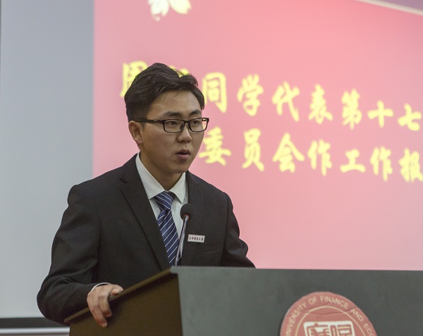 我校第十七届学生委员会副主席周强同学代表第十七届学生委员会作了主题为《不忘初心 牢记使命 为实现中华民族伟大复兴“中国梦”和“百年名校”江财梦贡献青春力量》的工作报告。
