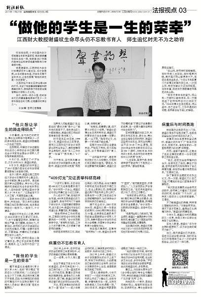 11月24日,江西日报官方微信以题为《“好想再回到您的课堂” 一起送送江西财大这位教授…》对谢盛纹教授典型事迹进行了推送。