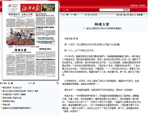 11月27日,《江西日报》头版以《师魂大爱 —追记江西财经大学会计学院教授谢盛纹》为题,报道了谢盛纹教授的典型事迹。相关链接:http://epaper.jxnews.com.cn/jxrb/html/2017-11/27/content_406416.htm。