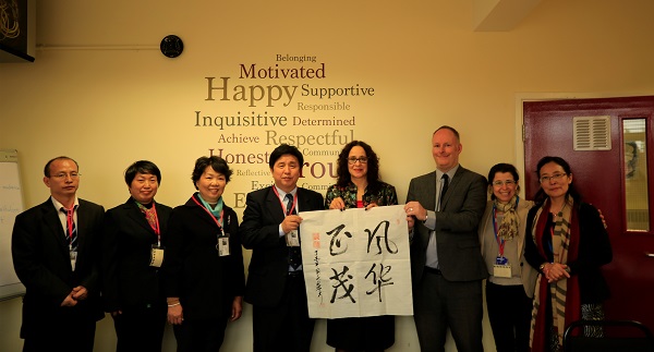 随后,王小平一行考察了Nicholas Chamberlain中学。该所中学是考文垂大学孔子学院的第一所合作中学,每周三的中午都会有汉语小课堂,该校学生积极参加,还常常有教职员工旁听学习。学生们通过汉语课堂这个窗口,学习中文,了解中国。王小平副校长一行人观摩了来自中山大学的志愿者白乙静老师的汉语课,课堂的热情氛围感染了王小平,他即兴为同学们用英文拓展讲解了当天课程的一些内容,受到同学们的热烈欢迎。在其此间王小平还与中学校方领导进行了友好交流,赠送了一份特别的礼物——自己提前准备的墨宝给校长、教务长和三个优秀学生。该校校长一再说“太珍贵了,一定要裱起来”。听该校校长说有一个高三的女生特别喜欢中国,而且想学经济学专业,王小平副校长立即表示非常欢迎其到江财留学,并可提供帮助。双方还讨论了江西财大附中与Nicholas Chamberlain中学建立合作关系的可能性。(图文/李秀香 万树平 陈丽萍 编辑/匡琳)