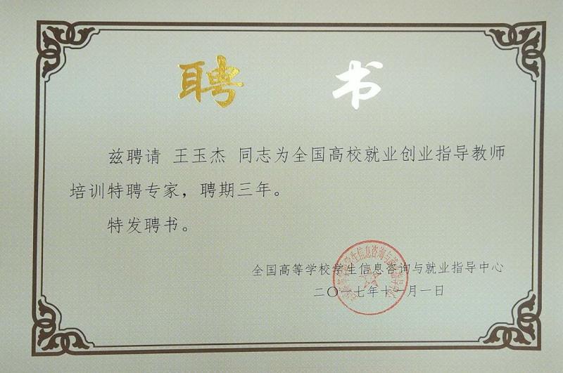 “11月底接到聘书,很感激能成为全国高校就业创业指导教师培训的特聘专家,这既是对我们学校在这方面的嘉奖,同时也是对我个人这十五年从事高校学生就业工作的肯定,我很开心。”王玉杰脸上带着亲切和蔼的笑容对记者说,很是平静的看待这份含金量极高的为期三年的聘书。