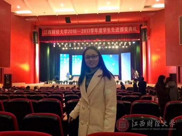 12月8日,江西财经大学2016-2017学年度学生先进颁奖典礼在蛟桥园大礼堂隆重举行,王枫从校长手中接过国家奖学金证书,手捧鲜花和校长合影留念。这是她江财生活最难忘、最美好的瞬间。