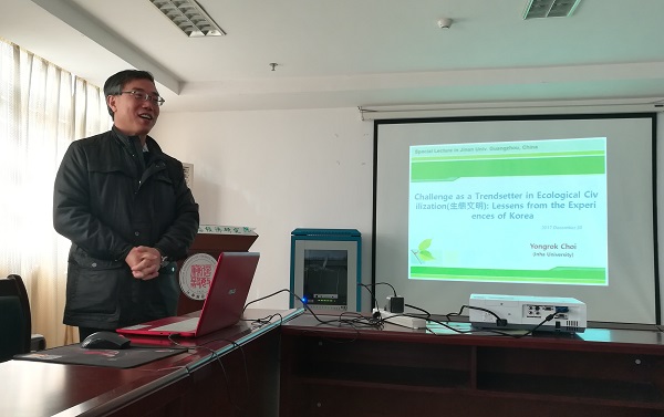 12月20日上午,Yongrok Choi作题为“Challenge as a Trendsetter in Ecological Civilization: Lessens from the Experience of Korea”的学术报告,生态经济研究院人口与区域生态研究所所长曾永明博士主持学术报告会。生态经济研究院、经济学院、国际经贸学院、旅游与城市管理学院等师生聆听了本次学术报告会。