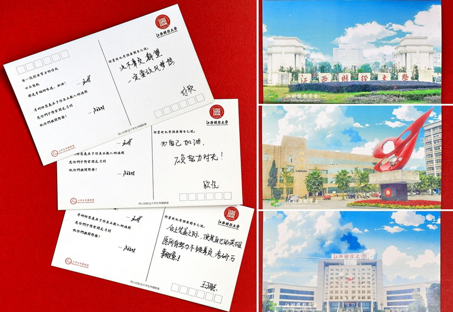 “学姐,你好!这是大学生传媒联盟送给你的祝福卡片,祝你考研成功!”12月20日下午,在校党委宣传部指导下,大学生传媒联盟精心制作了分别印有党委书记王乔、校长卢福财考研祝福语和签名的手绘明信片,赠送给参加今年全国硕士研究生招生考试的江财学子。