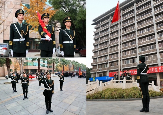 早上,江西财经大学国旗仪仗队精神抖擞,步伐矫健地来到旗杆下,随着威严的一声“升国旗,奏国歌,面向国旗敬礼”,五星红旗在庄严的国歌声中缓缓升到了旗杆顶端,此时,一轮红日也跃出东方地平线,五星红旗与初升的太阳构成天空中最美的图案。这样的场景已在江西财大校园延续了整整27个年头。