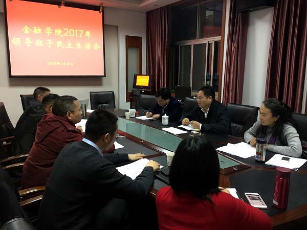 1月16日,金融学院召开2017年度领导班子民主生活会。领导班子成员围绕“认真学习领会习近平新时代中国特色社会主义思想,坚定维护以习近平同志为核心的党中央权威和集中统一领导,全面贯彻落实党的十九大各项决策部署,严格遵守中央八项规定和实施细则精神,坚决反对‘四风’”这个主题,开展班子对照检查和个人对照检查,进行批评与自我批评。副校长袁雄到会指导并讲话,学院领导班子成员参加会议,会议由学院党委书记王琪主持。