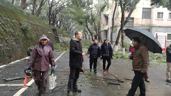 1月26日,校党委书记王乔和校长卢福财明确要求做好恶劣天气条件下各项应对准备,确保学校工作和师生生活正常运行。1月27日下午,校党委副书记蒋金法深入食堂了解留校师生餐饮情况,要求食堂保证热菜热饮供应,提供温暖舒适、干净整洁的就餐环境。副校长阙善栋全程指挥抗击冰雪活动。多次带领后勤保障处干部职工巡查校园、部署有关工作。1月27日晚8点,他顶风冒雪率领李新海处长等一行检查蛟桥园、麦庐园、枫林园校区受灾情况,指导救灾工作。并要求后勤保障处的干部职工,尤其是党员干部要提高政治站位,把抗击冰雪灾害,保障学校工作和师生生活正常运行作为重大政治任务来完成。
