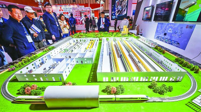 观众在“2017世界智能制造大会”展示区中国中车展位参观动车运行模型。新华社发
