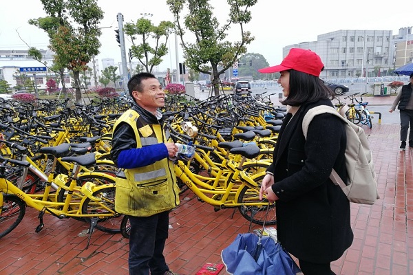 下午2时,虽小雨淅沥,但志愿者们的热情丝毫不减,在集合完毕后便立即开始了爱心送水活动。细雨中,那一位位穿着绿色雨衣冒雨清扫的环卫工人依旧坚守着自己的岗位。志愿者们在和他们解释清楚此次志愿活动的具体情况后将水一一递到他们手中,进行一次次爱心的传递。收到水的环卫工人都对这雨中的温情感到格外惊讶与欣喜,纷纷向志愿者们表达了他们真挚的谢意。
