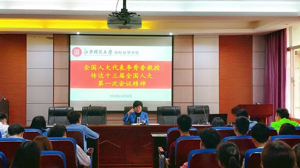 要把认真学习贯彻全国两会和校“双代会”精神作为当前和今后一个时期的重大政治任务,进一步学深、学细、学透,将会议精神贯彻落实到学院工作的全过程、各方面,全力做好年初确定的各项工作任务。3月27日下午,国际经贸学院党委组织召开了党委理论学习中心组(扩大)会和学生骨干学习会,认真学习传达贯彻全国“两会”和校“双代会”精神。全院教职工和80余名学生骨干分成两个会场进行了分组分阶段专题学习。全国人大代表李秀香教授应邀为师生传达两会精神。
