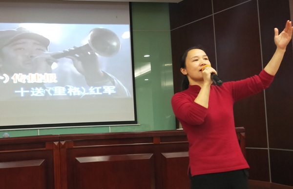 在激情教学中,学员们唱响了革命歌曲,一首歌曲代表了一个时代,每首歌宛如一面旗帜,琥珀般地凝固在历史丰碑中。学员们唱响了《三大纪律八项注意》《十送红军》《映山红》《红星照我去战斗》《毛委员和我们在一起》和《没有共产党就没有新中国》这六首歌曲,用经典的歌曲讲述了党史,以真实的故事打动了学员。