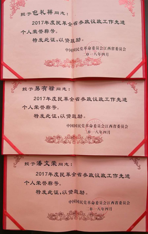 4月18日,民革江西省第十三届委员会第二次全体会议在南昌召开。会议进行了表彰活动。我校民革组织及3名民革党员获得民革省委会表彰:民革江西财经大学委员会被授予“2017年度民革全省参政议政工作先进单位”荣誉称号(全省5个);民革党员包礼祥、易有禄、潘文荣被授予“2017年度民革全省参政议政工作先进个人”荣誉称号。
