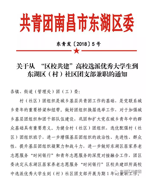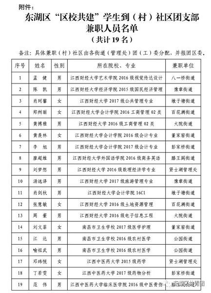 近日,共青团东湖区委发布《关于从“区校共建”高校选派优秀大学生到东湖区(村)社区团支部兼职的通知》,我校经济学院陈凯等13名同学被选派到江西南昌市东湖区豫章街道等9个街道担任村(社区)兼职团干,开展为期一年的兼职工作。