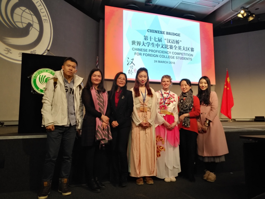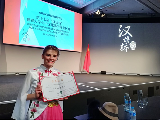在2018全英汉语桥比赛中,考文垂大学孔子学院选送的学生夏乐在全英汉语桥比赛非专业组中取得第三名的好成绩,这是考大孔院首次派选手参赛并获得了优异成绩。