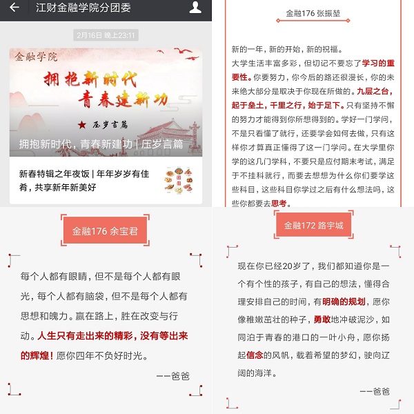 学院精心策划“春节感恩”系列活动,着力培养学生感恩父母、回报社会的道德情怀。回到家乡的金融学子通过与亲人话家常、写家书、“讨压岁言”等活动,记录着温暖、幸福的家庭时光。
