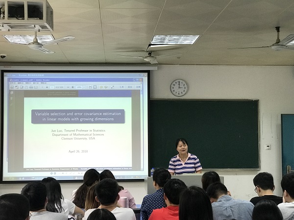 5月8日下午3时,克莱姆森大学罗俊副教授应统计学院邀请作题为Variable selection and error covariance estimation in linear models with growing dimensions的专题讲座。讲座由统计学院院长罗世华主持,统计学院部分教师及研究生聆听了此次讲座。