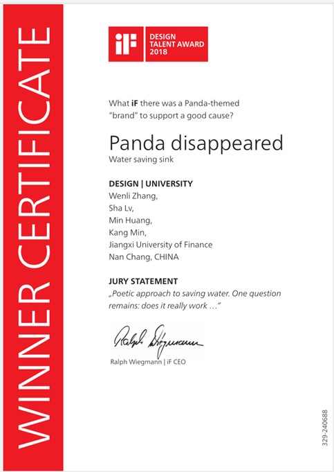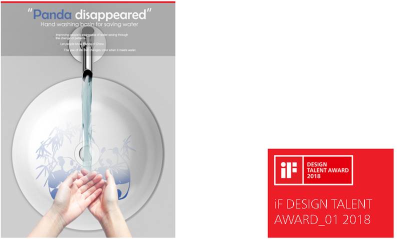 2018iF设计新秀奖共设4个参赛主题,该设计团队结合其中的“Panda brand for good cause”这一主题,与目前中国面临的严重环境问题联系起来,对人为活动造成的水资源浪费、环境污染进行了反思与设计,“Panda disappeared”设计作品将中国非遗剪纸的形式与新型敏水材质相结合、并运用在洗手盆的表面。通过直观可见的变化现象,从而进一步引发人们对环境保护的思考。正如大赛评委点评的那样,用诗意的方法来节约用水保护环境,剩下的就是要逐步增强人们自身的环保意识。该作品将会在位于德国汉堡的iF设计博物馆、iF设计奖官方网站和iF设计奖官方APP中进行展示。