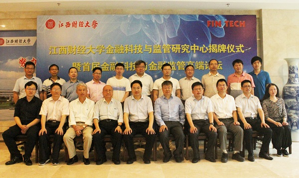 论坛开幕时,袁雄和汪洋共同为江西财经大学金融科技与监管研究中心的成立揭牌并与嘉宾合影留念。
