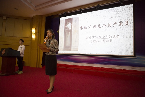 校档案管理中心李婷婷老师代表本次诵读红色家书比赛教工组深情诵读了红色家书《赵云霄写给女儿的信》,她深情并茂地再现了赵云宵烈士面对与孩子的生死离别时内心那种痛彻心扉的留恋和不舍,以及那纸短情长,对孩子的千言万语和所有的爱化为含血带泪的叮咛与期盼的情景。