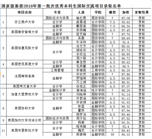 近日,国家留学基金委员会公布2018年“优秀本科生国际交流项目”(简称“优本”项目)第一批录取名单。我校国际学院(13人)、会计学院(8人)、金融学院(5人)、国贸学院(2人)、工商学院(1人)、统计学院(1人)等6个学院的30位同学录取该项目。据悉,“优本生”项目2018年面向全国高校计划选派4500人,我校第一批次推荐31人,获批30人,获批率为96.77%,充分显示了江财学子的实力。“优本”项目第二批次(明年春季入学)尚有部分名额,报名申请工作将在9月中旬启动,录取人数有望继续增加。