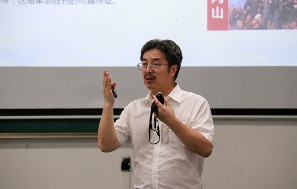 蒋书记结合实际主要从三个方面展开介绍。首先,“回顾历史上共产党人的初心”。从中国革命精神之源“红船精神”到“井冈山精神”,阐述了到共产党人的初心:为中国人民谋幸福,为中华民族谋复兴。其次是“坚守近现代共产党人的真心”。系统地介绍了我们党带领中国人民完成社会主义革命,确立社会主义基本制度的历程,重点讲述了中国共产党人在近现代史上伟大的历史贡献。最后“展望新时代共产党人的用心”。从政治、经济、文化、社会、生态文明等多方面加以阐释,重点讲述了十八大以来,以习近平同志为核心的党中央提出的“一带一路”倡议、经济新常态以及供给侧改革等重要论述,回顾了十八来取得的十大历史成就,号召广大青年学子“爱国、励志、求真、力行”。