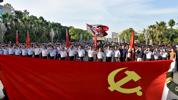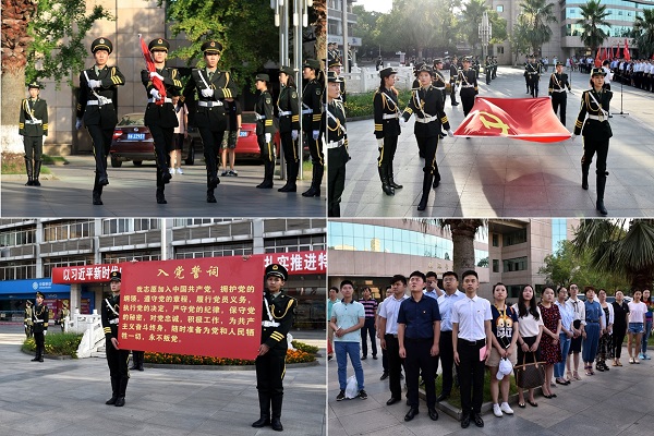 早上6时50分,国旗队方阵护送鲜红的五星红旗,迈着正步英姿飒爽地走向升旗台。在朝阳的万丈光芒下,升旗仪式开始。雄壮的国歌声中,鲜艳的五星红旗冉冉升起,在场师生面向国旗行注目礼。升旗仪式后,师生党员和入党积极分子面向党旗庄严宣誓,用铮铮宣誓声表达他们对党的绝对忠诚和对共产主义的坚定信念。