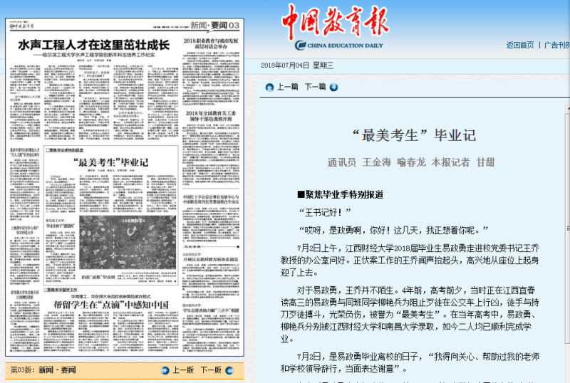 7月4日,中国教育报聚焦毕业生特别报道发表了题为《“最美考生”毕业记》文章,文章描述了我校2018届毕业生易政勇毕业离校的日子,引社会各界广泛关注,全文如下: