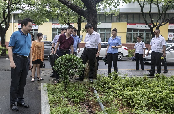 袁雄一行首先对蛟桥园校区道路保洁、绿化带保养等进行了检查,随后步行至北区综合楼、翼轸楼办公区域进行查看。督查发现,北区综合楼楼道杂物堆积问题在经过数轮督查后得到了部分解决,大部分杂物已经清理,但仍有部分区域杂物堆积依旧;图文信息楼周边台阶落叶、绿化带内纸屑等清理不够及时。翼轸楼环境卫生作为此前督查中发现的优秀典型,至今依然表现良好。
