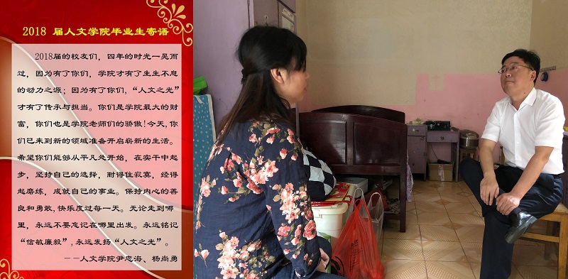 此前,人文学院党委书记杨尚勇,党委副书记李援多次走访毕业双困生家庭,亲切地与学生及学生家长交谈,了解学生家庭状况、经济来源和存在的困难,代表学校和学院向学生及其家人送去最诚挚的慰问,将浓浓的关怀之情带进了学生和家长的心中。学生表示,真切感受到了学校的关爱,心里倍加温暖,今后要更加努力学习,力争找到适合自己的工作用实际行动来回报学校和社会。