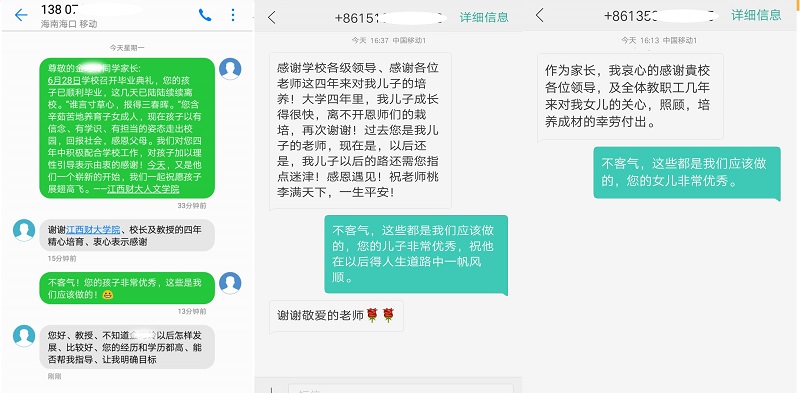 “尊敬的某某同学家长:6月28日学校举行毕业典礼,您的孩子已顺利毕业,现已离校。‘谁言寸草心,报得三春晖。’您含辛茹苦地培育子女成人,现在孩子以有信念、有学识、有担当的姿态走出校园,感恩父母、回报社会。我们对您四年期间积极配合学校工作,对孩子加以理性引导表示衷心感谢!今天又是一个崭新的开始,我们一起祝愿孩子可以展翅高飞。——江西财大人文学院”。