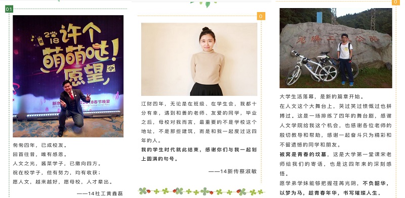 以2018届毕业生黄鑫磊为代表的十多位毕业生自发组织了祝福母校的活动。他们中有党员、学生干部、寝室长、学生社团成员等等,来自不同专业的他们回顾四年在江财的学习和成长经历,表达了对母校的祝福,并承诺会不忘初心,秉承“信敏廉毅”的校训精神和“敬业乐群,臻于至善”的江财精神,积极投身不同领域和岗位,踏实工作,回报母校和社会。同时他们也在毕业季寄语学弟学妹:人文之光撒四方,信敏廉毅存心间。