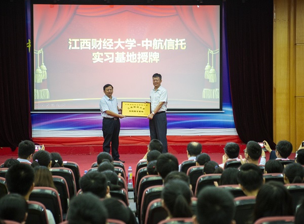 随后,卢福财为中航信托实践教学基地授牌,中航信托党委书记、董事长姚江涛代表公司接牌。中航信托党委副书记、总经理余萌致辞感谢并表示中航信托将通过信托人才实习基地的建立,有效助力信托专业人才从校园学习成长到社会从业实践的有效对接和过渡。