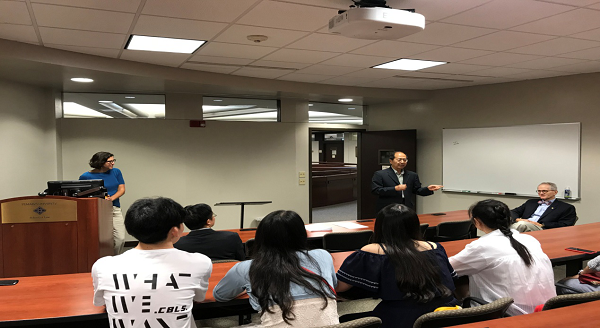 7月9日,圣玛丽大学法学院举行欢迎仪式,热烈欢迎杨德敏一行。欢迎仪式由圣玛丽大学法学院图书馆馆长、中国项目主任Robert H. Hu教授主持,圣玛丽大学法学院副院长Amy Harbergeri代表法学院致欢迎词。杨德敏回溯了两院合作的经历,并期望两院能在国际科研合作与长期交换生项目领域合作进一步推进。
