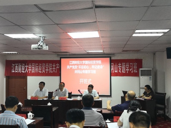 16日下午,国际经贸学院共产党员“不忘初心,牢记使命”井冈山专题学习班举行了开班仪式,副校长阙善栋应邀参加学习活动,并作开班致辞。阙善栋对学院2018年上半年的人才引进、学科建设、科研与研究生工作、国际化办学、党建与思想政治教育等方面工作给予了充分的肯定,他勉励学院教师党员要继续“不忘初心,牢记使命”,发挥好先锋模范作用,助推学院更好更快的发展。