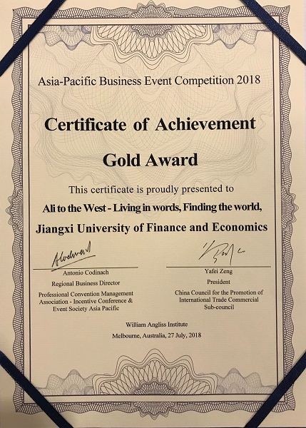7月27日,2018年亚太商务活动策划竞赛在墨尔本威廉安格利斯学院成功举行。来自中国、澳大利亚、印度尼西亚和越南等国家的8支队伍经过选拔赛和总决赛,我校旅城学院15旅游管理班李盛泽、黄书勤、王佳静、王丹婷和胡志宏等同学在刘德军博士的指导下,表现非常出色。策划作品《Ali to the Weast—Living in words, Finding the world》获得大赛一等奖和金奖,并授予胡志宏、王丹婷同学最佳展示奖。