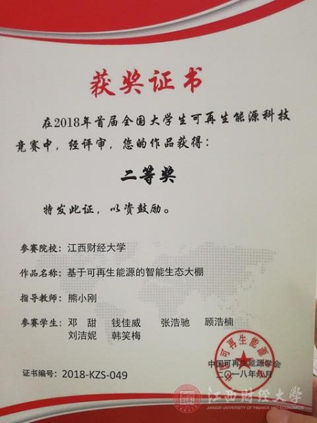 8月18至19日,首届全国大学生可再生能源科技竞赛全国总决赛在华北电力大学举行。来自108所高校的3000余名大学生参赛,经过审查共有500余件作品进入预赛,101件优秀作品参加作品展示和现场答辩。经过激烈角逐,最终评选出特等奖5项、一等奖27项、二等奖65项。由财税与公共管理学院信毅实践班邓甜同学带队,来自江西财经大学、北京大学、上海交通大学、华东师范大学、广西大学的6名同学组成的跨校团队(成员:邓甜、钱佳威、张浩驰、顾浩楠、刘洁妮、韩笑梅)凭借科技作品《基于可再生能源的智能生态大棚》(指导老师:熊小刚)获得全国二等奖。