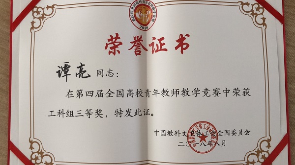 8月27日至31日,第四届全国高校青年教师教学竞赛在浙江师范大学成功举行,我校青年教师谭亮代表江西省高校参加了工科组的竞赛角逐,经过激烈的教学比拼,荣获大赛三等奖。