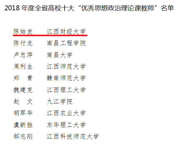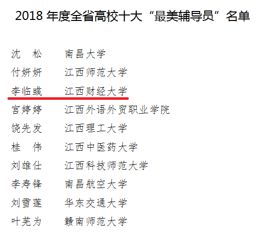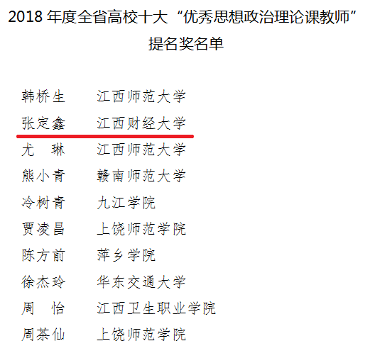 近日,江西省教育厅组织开展了2018年度全省高校十大“最美辅导员”、十大“优秀思想政治理论教师”评选工作。我校法学院分团委书记李临彧荣获“最美辅导员”称号,国际学院分团委书记廖春妍荣获“最美辅导员”提名奖,马克思主义学院院长陈始发荣获“优秀思想政治理论教师”称号,马克思主义学院教授张定鑫荣获“优秀思想政治理论教师”提名奖。