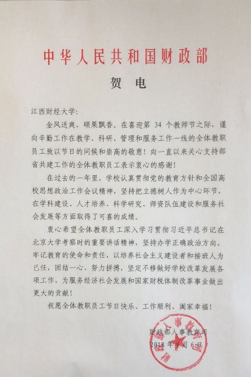 在第三十四个教师节即将到来之际,财政部向我校发来贺电,向辛勤工作在教学、科研、管理和服务工作一线的全体教职员工致以节日的问候和崇高的敬意,向一直以来关心支持部省共建工作的全体教职员工表示衷心的感谢。祝学校全体教职员工节日快乐、工作顺利、阖家幸福。