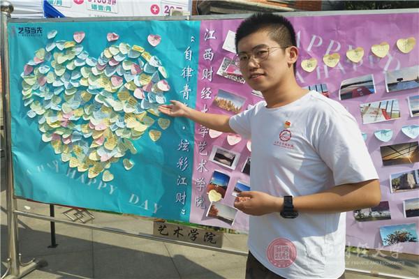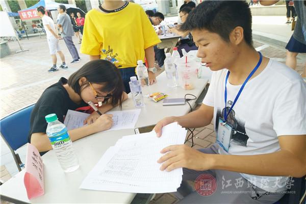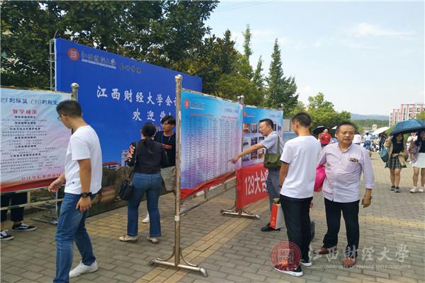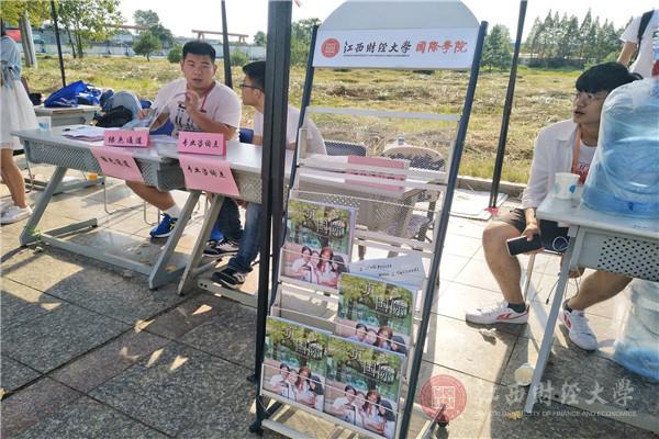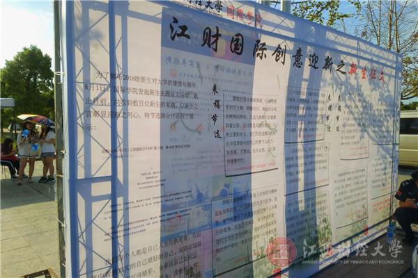 “办学院的特色刊物《一页国际》《记录》、和世界做朋友并为新生取英文名、给恩师或思念的亲人写信并帮新生寄出、与家人拍合影并由学院洗出发放等等都是我们学院的迎新传统”,国际学院的迎新人员如是说道。国际学院为更好地迎接新生,不仅沿袭了前几年学院迎新时的传统,而且也推出了新的特色活动。“码上国际”,即展示学生群或家长群二维码 ;“学长学姐帮帮群”,进群可帮助新生答疑解惑;“国际初印象”,录拍采访一些新生;“征文活动”,也就是在暑期向新生征集美文,在展板上展示其中优美片段……这些特色活动让江西财经大学在新生心中留下了良好的第一印象。会计学院对于迎新也设计了许多惊喜。在天气凉爽时,会计学院文艺部成员在摆点处对面的大型展板门口一展歌喉,甚至许多老师也参与其中,激发了新生对大学丰富多彩的校园生活的向往。会计学院统一着装的院服、新生家长的微信群、为学生和家长打伞等贴心行为无一不体现了会计学院的团结以及对新生的温暖。