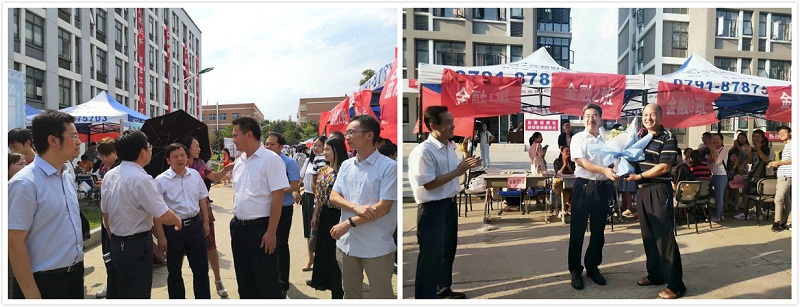 在金融学院迎新现场,卢福财和蒋金法与工作人员亲切交谈,蒋金法为辅导员代表周洪老师送上鲜花,并致以教师节的问候。