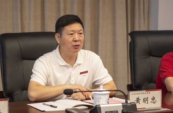 江西外语外贸职业学院院长黄明忠介绍了职教本科班在今年的招生情况、新生报到率情况,学院的特色专业、教学情况以及在近年内取得的成绩,感谢我校对联合办学的大力支持。他认为,在本科实验班已完成一轮教学后,应当及时进行总结工作,总结经验、制定标准,以指导今后的教育工作。同时,他表示希望今后能与我校加强交流沟通,更好地将两校“优势基因”联合在一起。