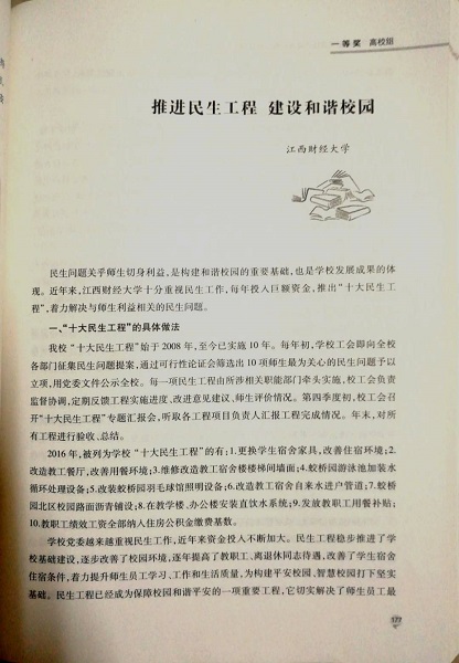 评委在点评中谈到:“推进高校民生工程建设是推进平安校园建设的重要内容和重要手段。江西财经大学结合实际,每年推出“十大民生工程”,提升了师生的幸福指数及校园和谐平安满意率,保障了师生的安全和稳定。该成果所展示的平安校园建设途径、方法具有创新性,工作成效明显,实效性强,值得推广和借鉴”。(图文/保卫处 罗威)