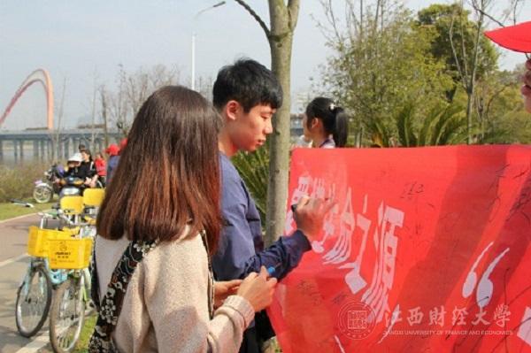 场地的另一边,横幅拉起,签名征集开始。志愿者们积极寻找路人,并向他们科普水资源保护的相关知识,对此,大家都挺支持的,纷纷在横幅下签上了自己的名字。活动的顺利展开,使得志愿者们的心情愉悦了许多,活动尾声,面对艾溪湖清澈的湖水、温暖的阳光,志愿者们在横幅上坚定的写下了自己的名字,留下了他们对水的承诺。